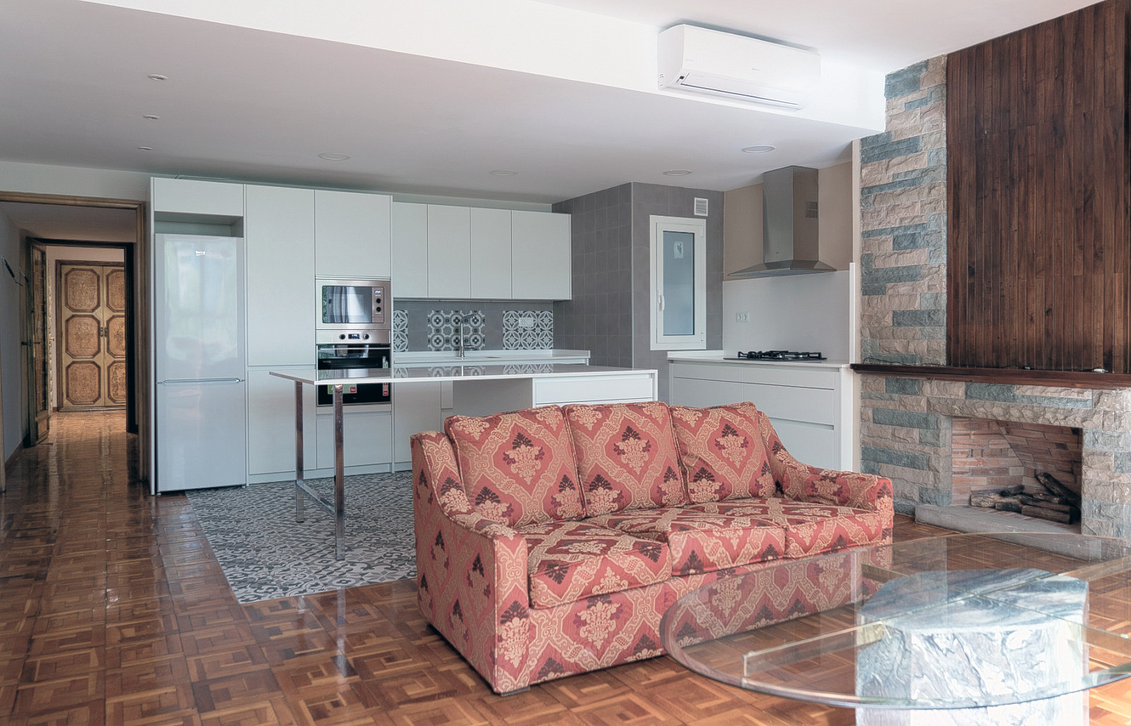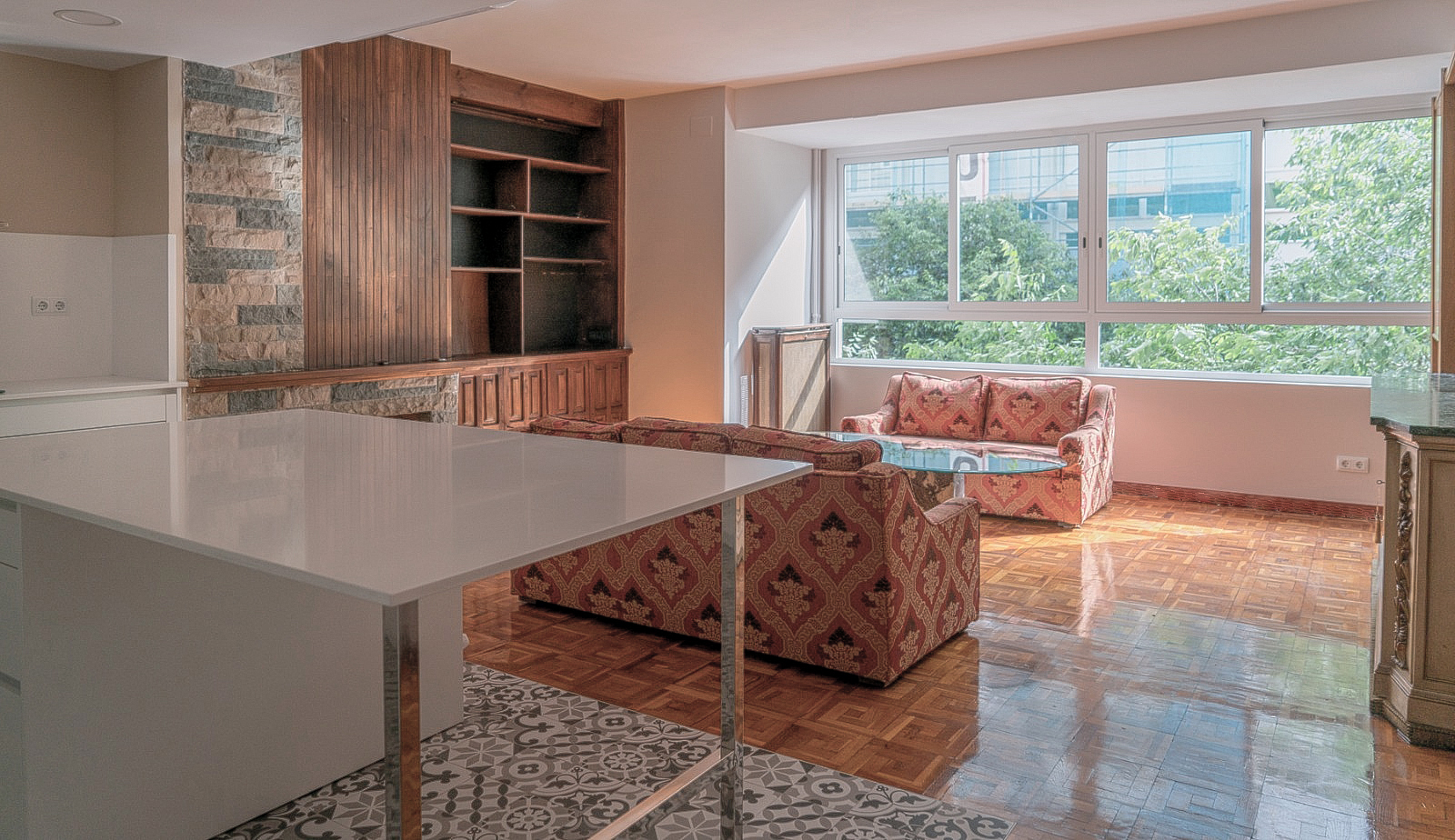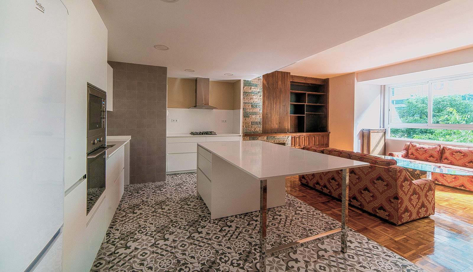 Se derriba el muro que separaba la cocina y el estar, consiguiendo un espacio diáfano, más espacioso y luminoso.